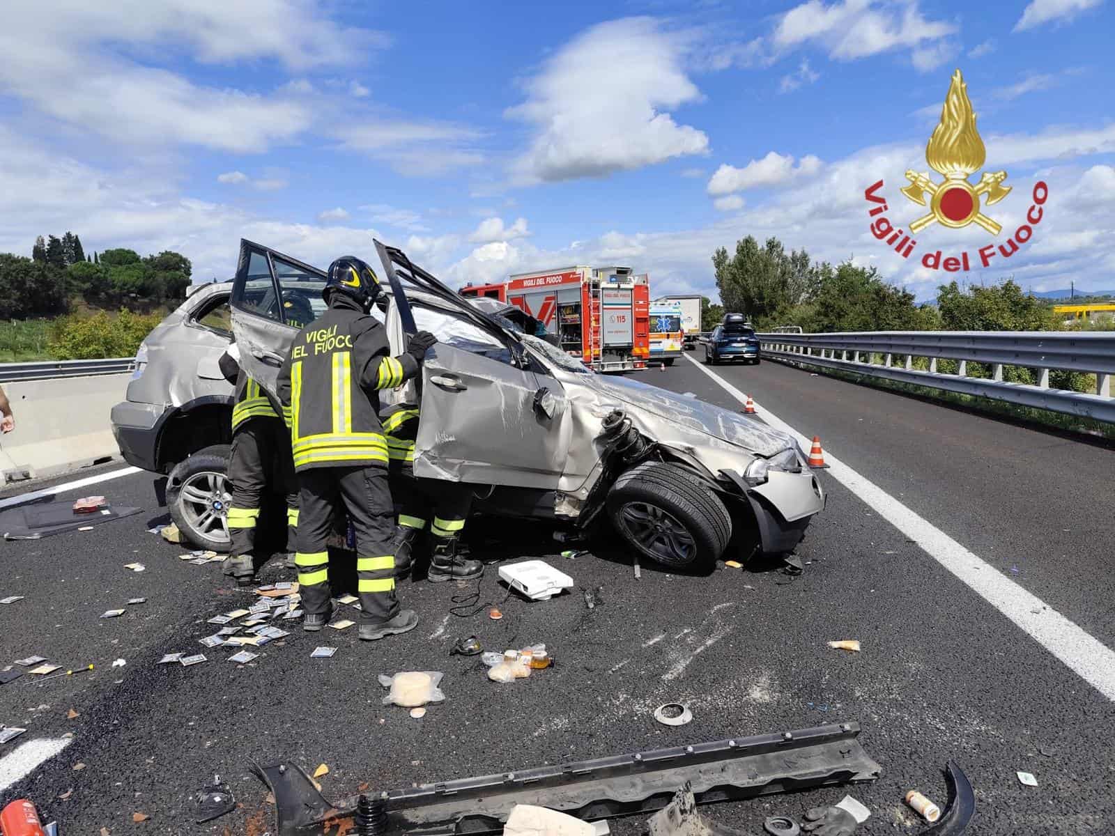 Intervento dei Vigili del Fuoco del Comando di Arezzo, Distaccamento di Cortona, alle ore 12.30 di oggi per un incidente stradale avvenuto in Autostrada A1, al km 378 in direzione nord.
