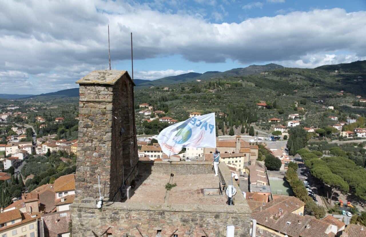 Prima il piazzale del Cassero si è trasformato in una “tela bianca” su cui gli studenti hanno realizzato il simbolo della pace, poi gli amministratori sono saliti sulla Torre del Cassero dove hanno posizionato la bandiera rappresentante una colomba e un ramoscello di olivo.