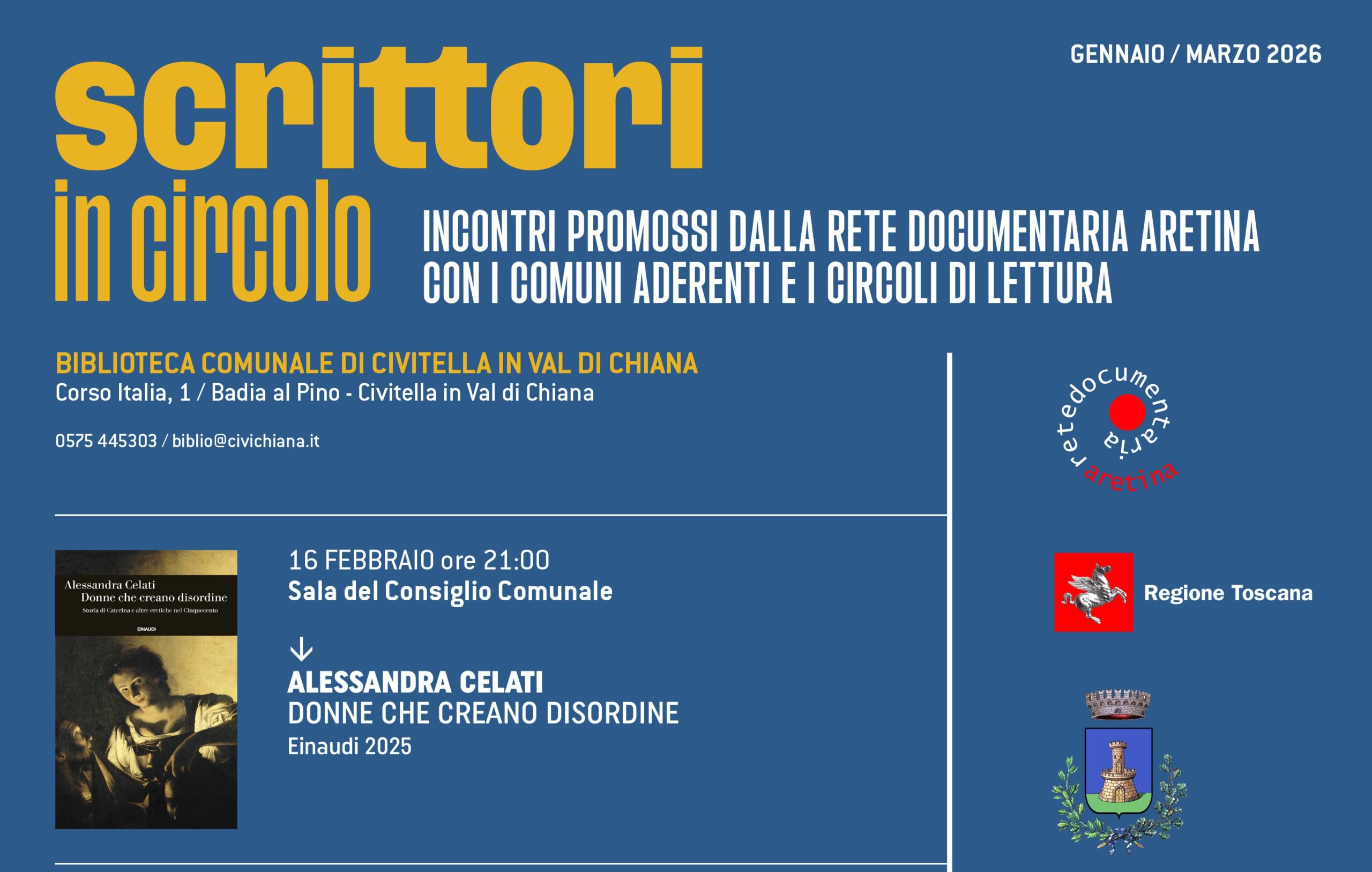 Sarà Alessandra Celati, con il suo ultimo libro “Donne che creano disordine. Storia di Caterina e altre eretiche nel Cinquecento” edito da Einaudi, la prima autrice ospite lunedì 16 febbraio, alle ore 21, presso la Sala del Consiglio Comunale di Civitella a Badia al Pino, del festival “Scrittori in Circolo”, rassegna d’incontri letterari a cura della Rete Documentaria Aretina e sue le biblioteche, di 11 Comuni, in collaborazione con i circoli di lettura della provincia e la Libreria Feltrinelli di Arezzo, con il sostegno della Regione Toscana.