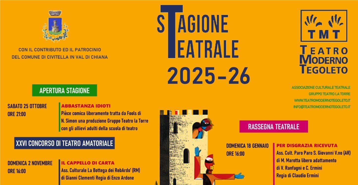 Si alza il sipario il 25 ottobre sulla nuova Stagione teatrale del Teatro Moderno di Tegoleto con 18 spettacoli in cartellone fino ad 22 marzo 2026.