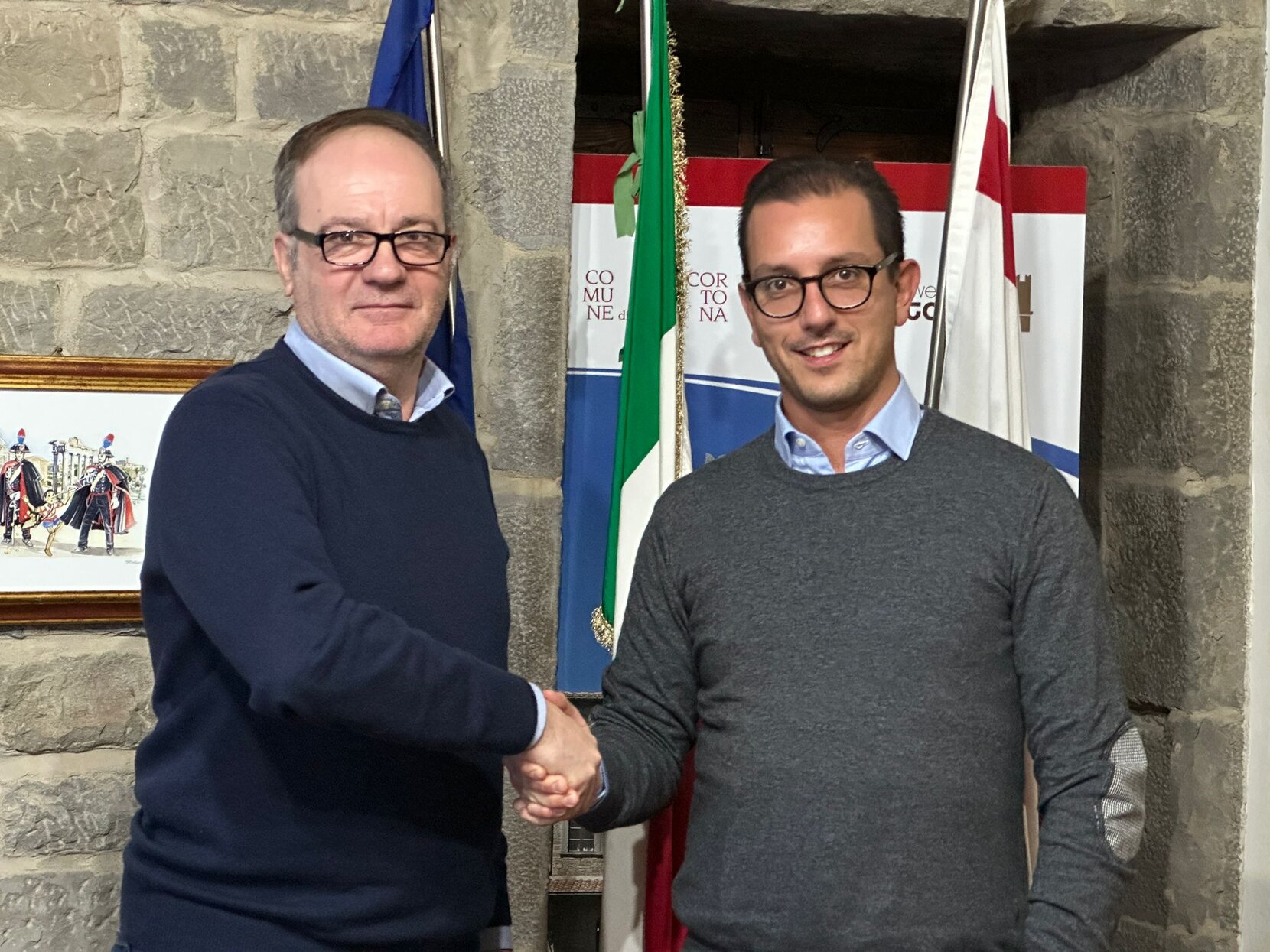 Una stretta di mano dal significato profondo quella fra il sindaco Luciano Meoni e il presidente dell’Unione dei Comuni montani del Pratomagno, Marco Ermini.