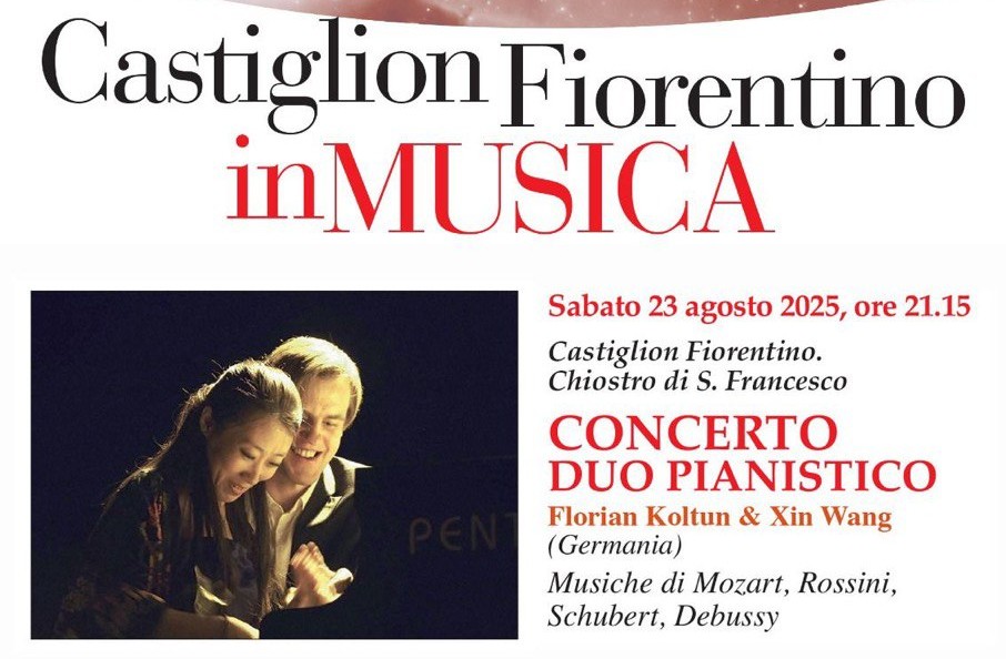Prosegue l’estate musicale di Castiglion Fiorentino con il Festival Terre d’Arezzo. Dopo il suggestivo concerto di lunedì 4 agosto con “La musica tra parole e immagini del “Trio Calliope”, sabato 23 agosto 2025, alle ore 21.15, il Chiostro di San Francesco ospiterà il concerto del Duo Pianistico formato da Florian Koltun e Xin Wang, due interpreti di fama internazionale provenienti dalla Germania.