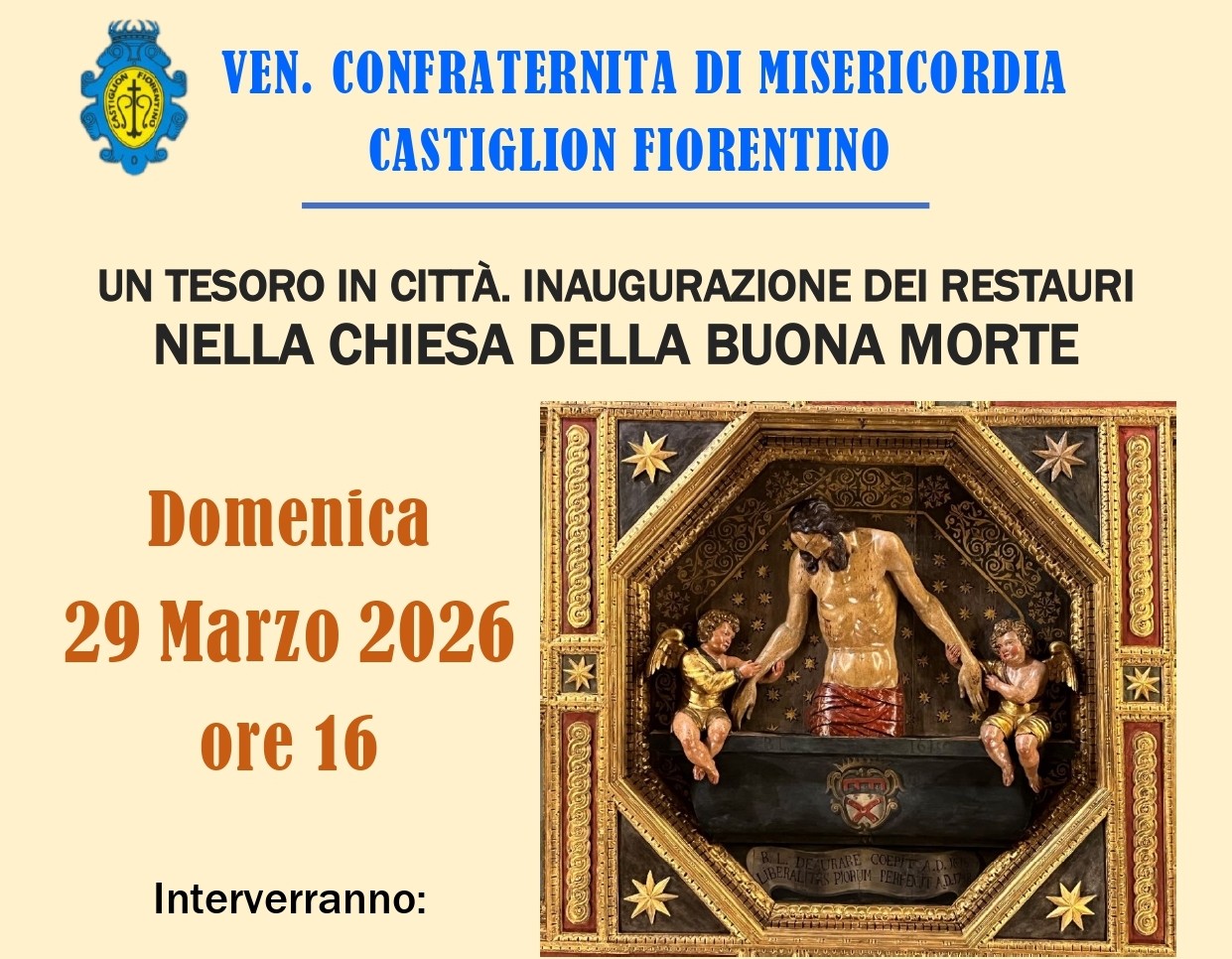 Così nella Domenica delle Palme, Castiglion Fiorentino apre la Settimana Santa, con l’evento “UN TESORO IN CITTÀ. INAUGURAZIONE DEI RESTAURI NELLA CHIESA DELLA BUONA MORTE” che vede la partecipazione, tra gli altri di Ilaria Pennati della Soprintendenza di Siena, Grosseto e Arezzo, dello storico dell’arte, Alessandro Valenti oltre che ai restauratori, Ida Bigoni, Paola Cardinali e Francesco Conti.